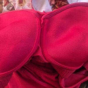 Nike racerback tank in vibrant red. Built-in support with mesh detailing across the bust. Reflective Nike Swoosh on chest. Breathable athletic fabric. Great for workouts and running.