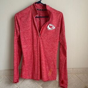 Red Nike quarter-zip pullover with team logo. Comfortable and stylish.