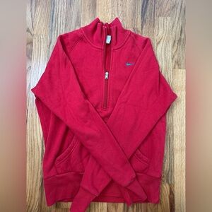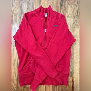 Vibrant red Nike sweatshirt with quarter-zip. Blue logo on chest.