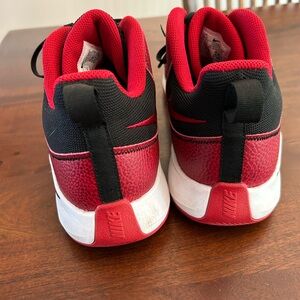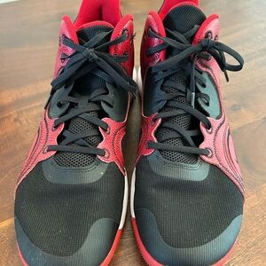 Stylish Nike athletic shoes. Red and black color scheme. Perfect for sports and casual wear.