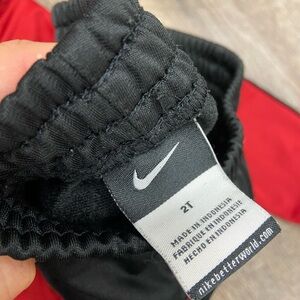 Nike tracksuit with a red jacket and black pants. Features Nike logo.