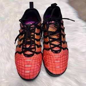 Dynamic red and black design. Perfect for workouts and casual wear. Comfortable and stylish.