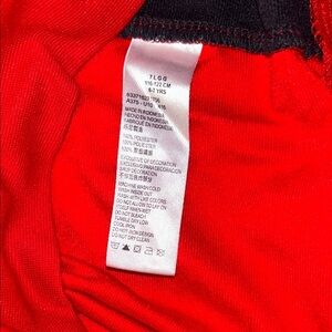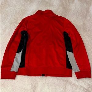 This Nike jacket combines a bold red color with black side panels for a striking look. Featuring a high stand-up collar and a full-length zipper, it offers both style and functionality. The jacket's performance fabric ensures comfort and durability, making it a versatile choice for various activities.