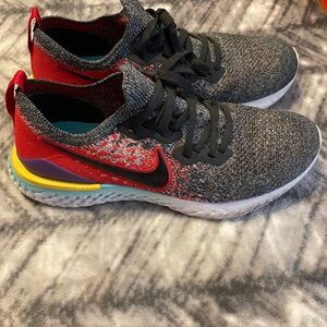 Dynamic Nike shoes with a red and black knit design. Features a white sole with yellow and blue accents.