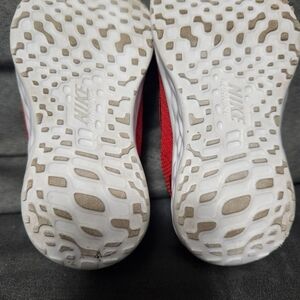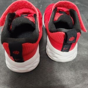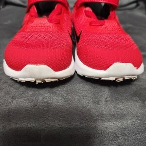 Worn only twice. These Nike sneakers feature a vibrant red and black design, perfect for making a bold statement. The breathable mesh upper ensures comfort, while the wide velcro strap offers easy fastening. With a cushioned sole, these sneakers provide excellent support for active wear.