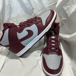 Step into style with these Nike sneakers, showcasing a bold red and gray color palette. Crafted from premium leather, they feature a classic silhouette and a comfortable lace-up closure, perfect for any occasion.