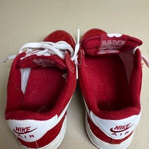 These Nike sneakers boast a striking red and white colorway, featuring a classic low-top silhouette with a suede and leather upper. The iconic white swoosh and midsole, along with traditional perforations, make them a timeless addition to any sneaker collection.