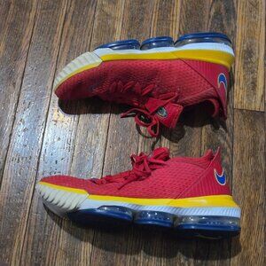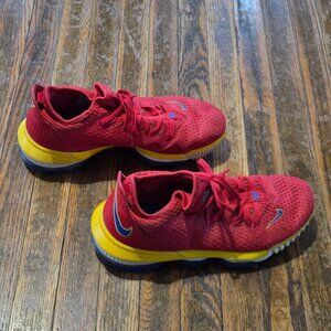Bold red upper with vibrant yellow accents. Blue soles for a striking contrast. Perfect for athletic performance.