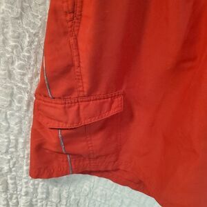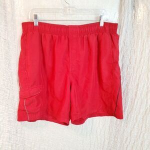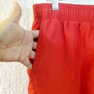 Classic red color men swimming trunks. Stretchy waist with drawstrings. Pre-owned in overall good condition. Small imperfection as pictured. Please refer to pictures for best description and condition verification.