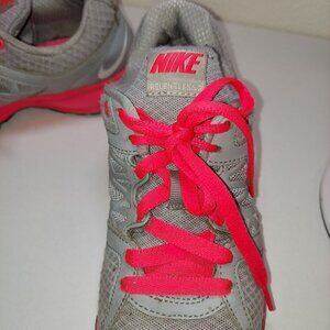 The Nike Relentless2 Women's 7.5 Running Sneaker is a lightweight shoe featuring a gray body with a white reflective swoosh. The pink laces and bottom trim add a pop of color to this stylish, comfortable shoe.