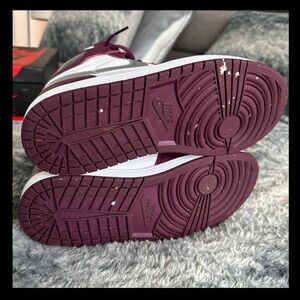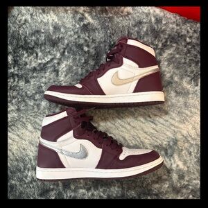 Stylish Jordan sneakers. Burgundy and white design. Iconic logo on the side.
