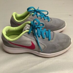 Nike Revolution 3 running sneakers gray neon yellow blue pink. EUC. Tread has plenty of life left. Cleaned and no odors. Smoke free home
