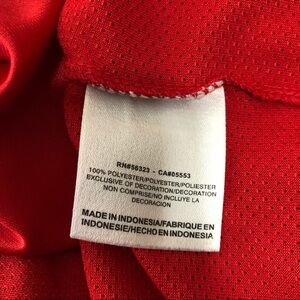 This shirt is in good/okay condition. It has small snags in the material in several different places all over. See photos. It has no rips stains or tears though. It has lots of life left in it and perfect for practice. The back of the shirt is a breathable mesh. Material stretches,