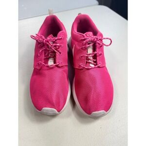 Vibrant pink Nike Roshe One sneakers offer both style and comfort. These shoes feature a breathable mesh upper, providing excellent ventilation for your feet. The iconic white Nike Swoosh adds a classic touch, complementing the lightweight white sole that ensures cushioning and support. Designed for casual wear and light athletic activities, they effortlessly combine fashion and functionality. These Roshe Ones are perfect for a morning jog, a casual stroll around town, or adding a pop of color to your everyday outfit.
