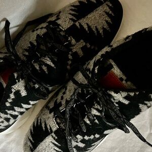 Elevate your running game with these Nike Roshe Pendleton sneakers. The shoes feature a unique geometric pattern and are made with a wool upper material, making them perfect for any season, whether it's winter, summer, fall or spring. The lace-up closure ensures a secure fit, while the Nike Run product line guarantees superior performance and activity. These sneakers are perfect for any athletic woman looking for a stylish and comfortable pair of shoes. The black and white design adds a pop of color to any outfit, and with a style code of 842849-994 and model release year of 2016, you can be sure you're getting a trendy and up-to-date pair of sneakers. Don't miss out on this opportunity to add the Nike Roshe Pendleton sneakers to your collection.