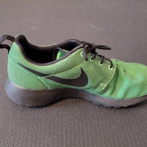 These are a pair of Nike Roshe Poison Green shoes. I would rate the condition as very good with minimal wear on the soles. They were worn ~10 times before I realized that my foot is too narrow for this style of shoe. These are a US size 9.5 and feature a mesh upper and foam midsole. Despite the shoes being slightly too roomy, they were also very comfortable and breathable. They are a great spring/summer shoe!