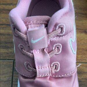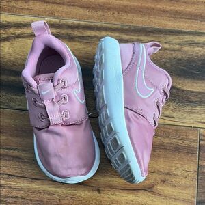 These Nike sneakers showcase a sleek and modern design with a pink textile upper and a contrasting white midsole. The minimalist style is enhanced by a subtle Nike swoosh logo, making them perfect for casual or athletic wear. Experience comfort and style with these lightweight sneakers. Gently used. Slip on.