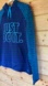 Bold royal blue Nike hoodie. Features 'Just Do It' text. Patterned sleeves add style. Sleeves feature thumb holes. Spot on front pocket as noted in picture. Great sweatshirt for a fall jog.