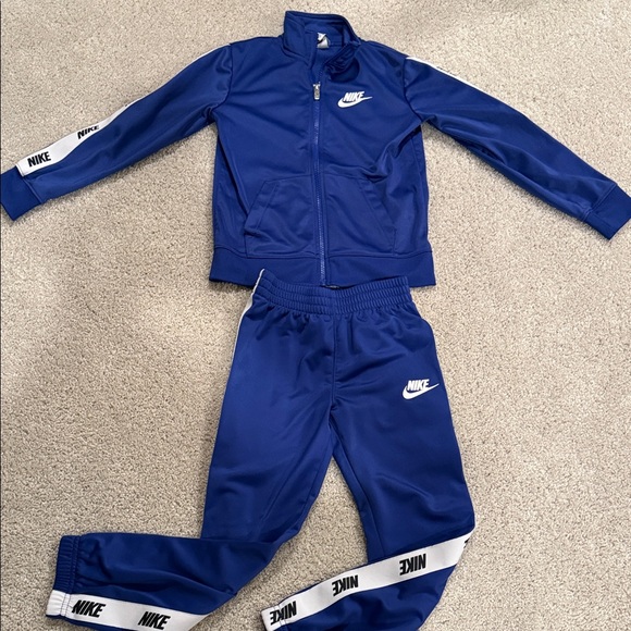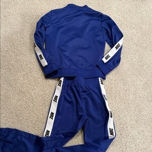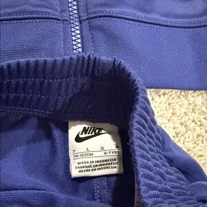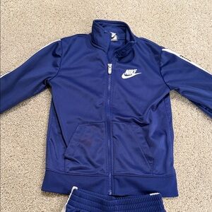 Sleek royal blue tracksuit featuring Nike logo. Includes zip-up jacket and matching pants with white stripe detail. Kids size 7. Good used condition