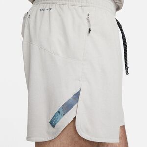 Elevate your workout wardrobe with these Nike Running Division Men's Stride 4" Shorts. Designed with the active man in mind, they feature Nike's innovative Dri-Fit technology to keep you dry and comfortable during intense workouts. The neutral beige color paired with subtle silver and blue accents offers a stylish yet athletic look, perfect for any gym or cross-training session.