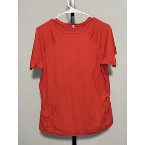 This is a Nike women's active top in size Large, designed for running and jogging. It features Dri-Fit technology to keep you dry and comfortable during physical activities. The color of the top is orange, perfect for adding a pop of color to your activewear collection.