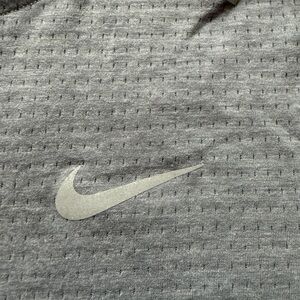 The Nike Running Shirt in Gray is a stylish and comfortable activewear piece, perfect for gym workouts, running, or athleisure activities. Made from a blended fabric with reflective strips and the Nike logo, this lightweight and breathable shirt features a crew neck and short sleeves for ease of movement. Ideal for all seasons, this pullover shirt in size Mens M offers a regular fit for a comfortable and supportive experience during your active pursuits. With its sporty design and quality material, this Nike Dri-FIT shirt is a must-have for any fitness enthusiast.