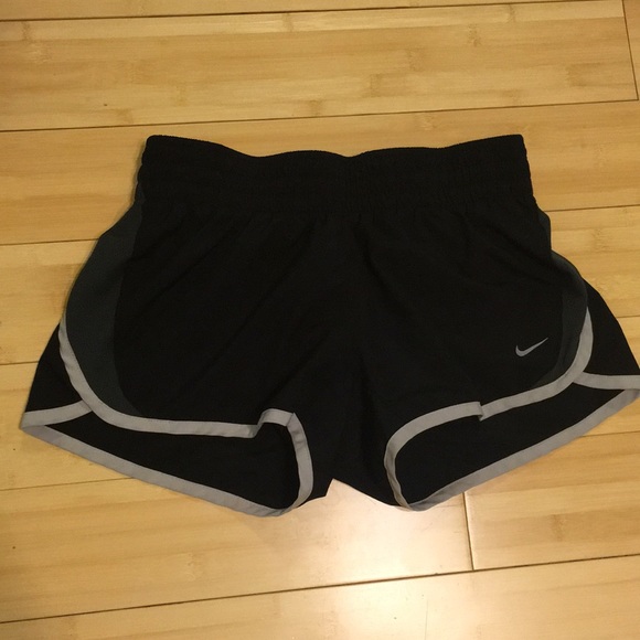 Dry-fit Nike running shorts. Worn once or twice, no damage. Black with grey and off-white accents. Built-in liner. Runs on the smaller side.