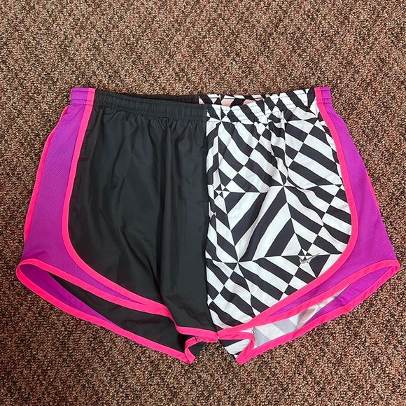 Gray on one side with gray and print on the other. Hot pink and purple trim.
