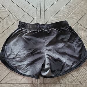 These Nike Running Shorts for women in size Small feature a solid black color with a drawstring closure for a secure fit. Made from polyester with a blended fabric, these athletic shorts have a 3-inch inseam and are designed for activewear occasions such as running, jogging, training, and volleyball. The shorts are lined, moisture-wicking, breathable, and offer comfort with an elastic waist and inner waistband pocket. The Nike brand, athleisure theme, and sporty style make these shorts a stylish and functional choice for active women in the spring and summer seasons.
