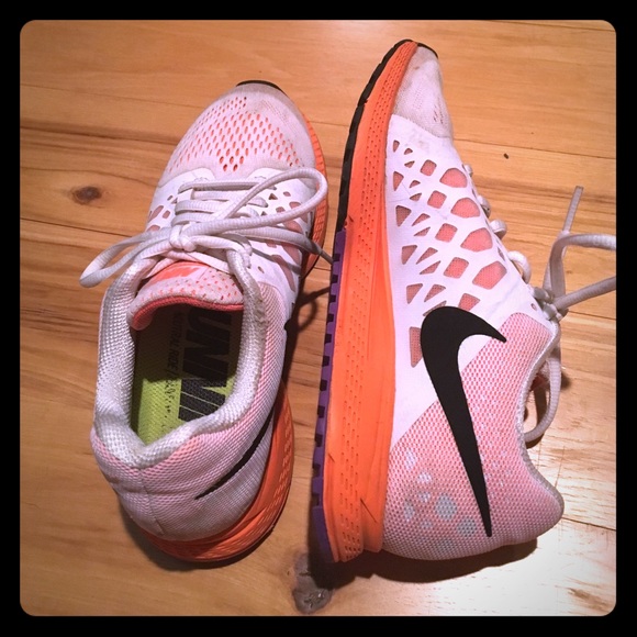 Very gently used Nike running shoes! EUC, tiny place of wear on shoe (see photo). Interior supports and soles are in fantastic condition! Haven't been cleaned. Orange, purple, and white color combination.