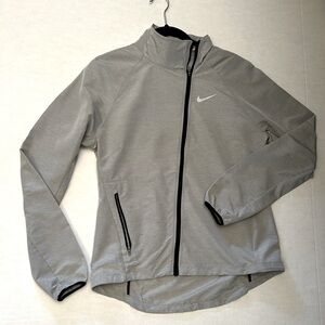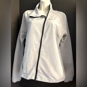 Nike light gray(silver) jacket in 100% polyester. Full zipper with 1 front zipper pocket. Pre owned in great condition. Very light weight perfect for travel.