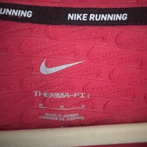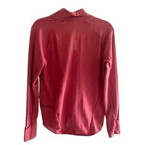 This pink long sleeve pullover quarter-zip top is by Nike. The Therma-Fit top is perfect for the cold weather outdoor activities. It has a hi low bottom hem so it’s perfect for leggings. The top features a back zipper pocket, fold over hand coverings and has a back reflector piece on the upper back. It is women’s size medium. Fantastic condition!