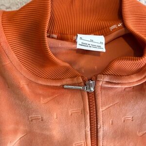 Nike zip-up jacket in a warm rust orange. Ribbed collar and zip closure. Subtle embossed texture on fabric.