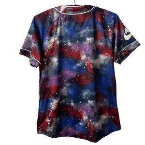 Baseball style jersey featuring white trim and buttons on a cosmic galaxy print with Nike SB embroidered on the left chest