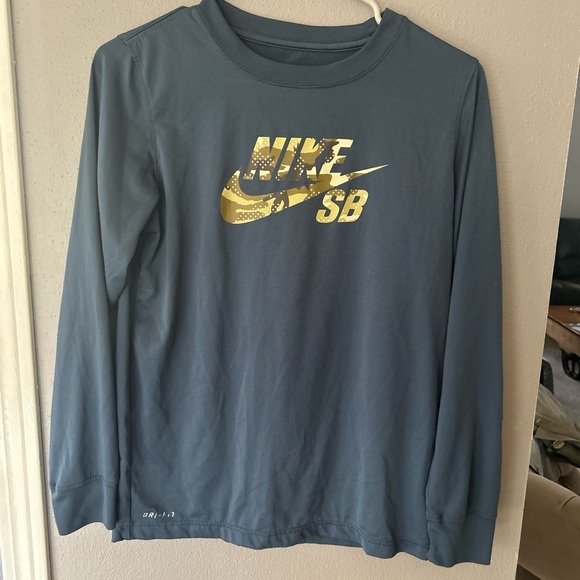 Nike SB Dri-FIT shirt with white logo on gray fabric. Ideal for skateboarding.