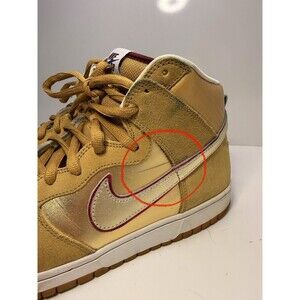 Authentic Nike Dunk High Premium SB sneakers (Style Code: 313171-702) in Metallic Gold / Tan / Red accents.