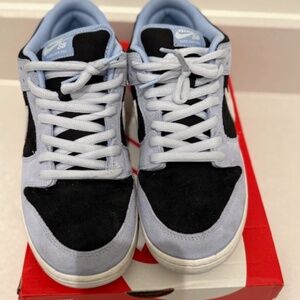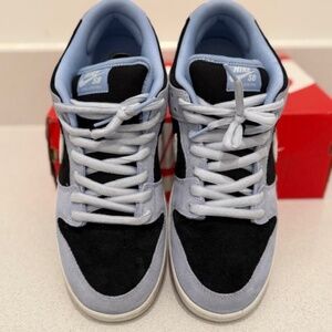 The Black Aluminum Nike SB Dunk Low is mostly made of suede. The base of black suede makes up the toe box and side panels as well as the heel area, while Aluminum blue suede overlays form the eyestays, mudguard, and heel and ankle strap. The Nike swoosh appears in Football Grey on each side, while the Nike brand name is stitched in white thread into the heel collar. The cushioned black tongue also contains a Nike patch. A white midsole and grey outsole round out the shoe's look.
