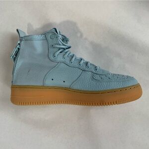 Nike Special Forces Air Force 1, made in Vietnam. Boys size 6Y, EU size 38.5 = US ladies size 7.5. Appear to be unworn with a mark or two from handling that can be easily removed. Ballistic nylon and leather. Dual zippers up back with ankle strap for locked in fit. Rubber sole for traction. Color is “Ocean Bliss”
