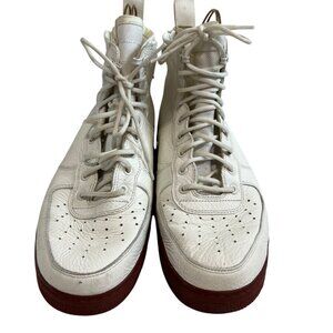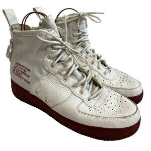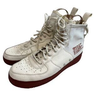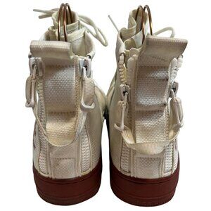 Nike SF Air Force 1 Mid sneakers in Ivory Mars Stone, lightweight, white nylon and leather, double zippers, lace up, earthy red-brown soles, US men's 12, preowned and shows wear on the soles, discoloration throughout - see photos