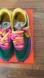 Bold Nike sneakers with vibrant pink, green, and orange hues. Perfect for a stylish look. These are moderately worn but nothing a cleaning can’t fix.