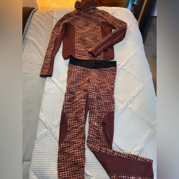 Great outfit for that early morning jog, bicycling or walk, fits snug so works for smaller body frame. Has a mock style neck, shear on the leg area but a great outfit with the right type of shoes.