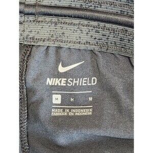 These Nike Shield Pants for men in size M are dark gray joggers made from a blend of polyester, nylon, and spandex. These woven pants feature a drawstring closure, elastic waist, and a tapered leg style, making them suitable for activewear occasions such as gym training, cross-training, and running. With the brand's signature style and features like easy care, lightweight feel, and quick-dry material, these Nike Shield Pants offer comfort and performance for the modern man on the go.