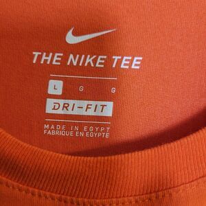 This Nike Dri-FIT shirt for men in size Large is a must-have for any sports enthusiast. The shirt has a crew neck and long sleeves with a solid woven cotton blend fabric type. The shirt features the Nike Swoosh logo in blue and is orange in color. The shirt is machine washable and has moisture-wicking features, making it perfect for workouts. The Nike Dri-FIT shirt is a classic piece and can be worn as a T-shirt or as an underlayer. This shirt is perfect for any occasion and can be paired with shorts or joggers for a complete look.