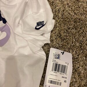 White Nike tee with bold purple and yellow 'Just Do It' print. Paired with comfortable purple shorts. Ideal for everyday style. Brand new and both are a size 3T. Bought together to be a set. Shirt is Nike, shirts are another brand.