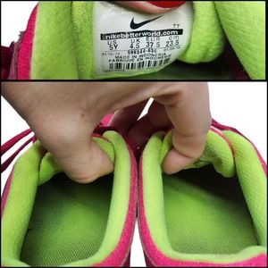 Good condition pink and neon green youth size 5 or will fit a womens 6.5 Nike tennis shoes. Very light wear on the exterior as shown with minimal blemishes, some wear on insoles as shown.