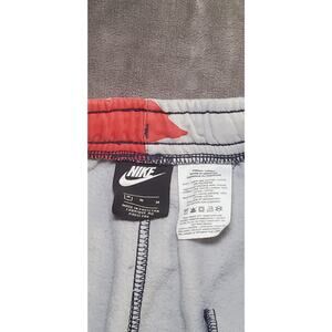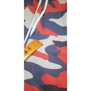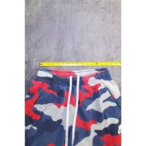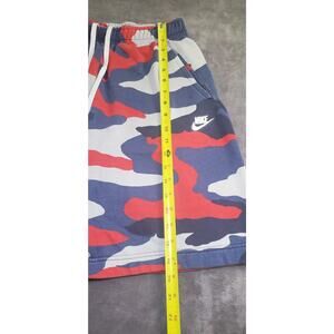 The Nike Men's Shorts in size M feature a stylish camo fleece design with drawstring pockets for a comfortable and adjustable fit. Made of a blend of polyester and cotton jersey fabric, these jogger-style shorts are perfect for casual or travel occasions. With a flat front and 8-inch inseam, these shorts offer a regular fit and are adorned with outdoor, flag, and sports themes. The multicolor camouflage pattern adds a trendy touch to this versatile and functional piece of men's clothing. Caja23-32