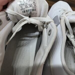 This pair is a versatile white leather with grey accents and metallic silver detailing on the Shox units and heel badge.