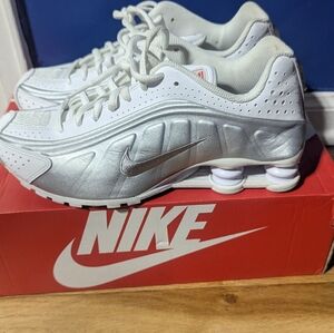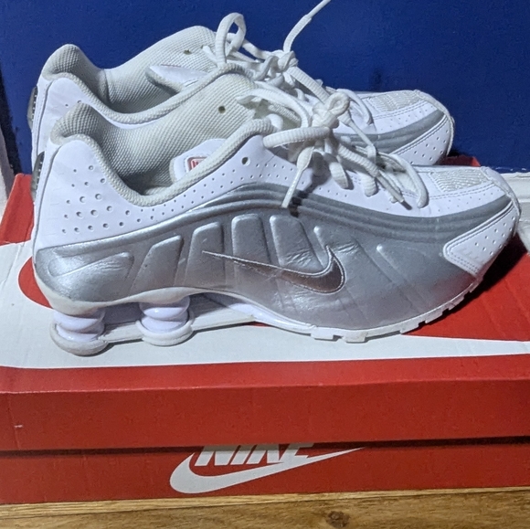 Silver Nike Shox R4. cleaning out my closet. shoes in great condition. youth 7 but women 8.5 I would say.