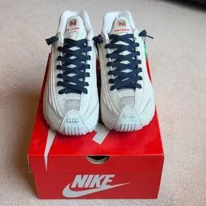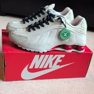 Nike Shox sneakers in white with red accents. Features a sleek design and comfortable fit.
