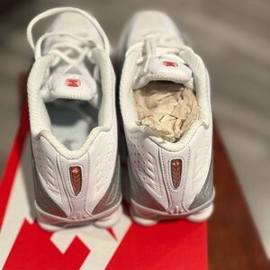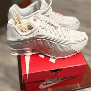 Nike Shox R4 featuring a sleek white and metallic silver design. Ideal for everyday style. True to size